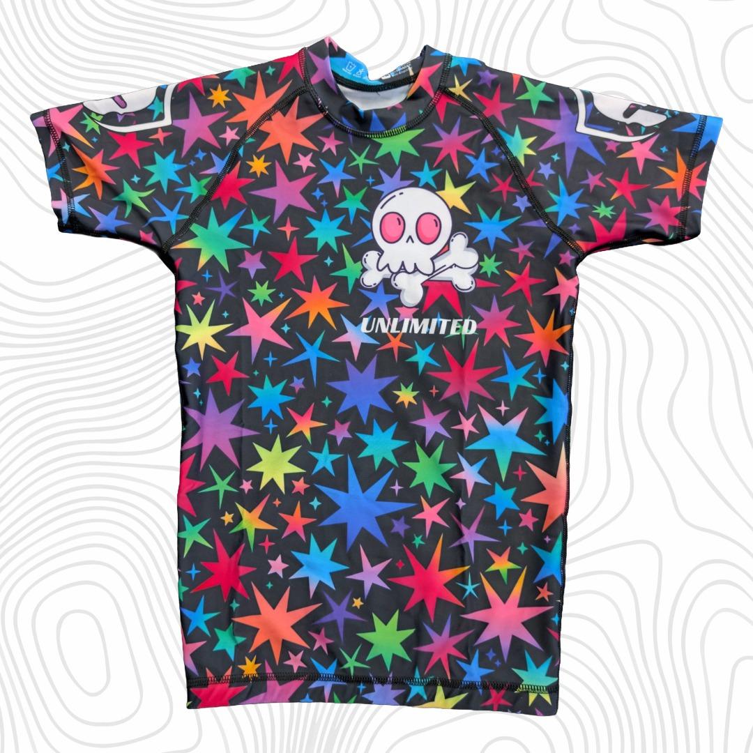 Stand out on the mats with our Rainbow Stars Rashguard, featuring short sleeves and vibrant stars on a sleek black background and a playful skull design. Created by one of our talented female youth students, this rashguard combines unique style with premium comfort and durability—perfect for training, rolling, and making a statement.